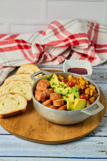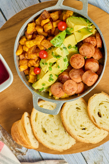 Eggs are an excellent source of protein and essential vitamins. Rice provides complex carbohydrates that will give you the necessary energy for the day. Ranch-style sausage adds extra protein and a distinctive flavor. Avocado is rich in healthy fats, vitamins, and essential minerals. Finally, ripe plantain adds fiber and important nutrients, along with a touch of natural sweetness.